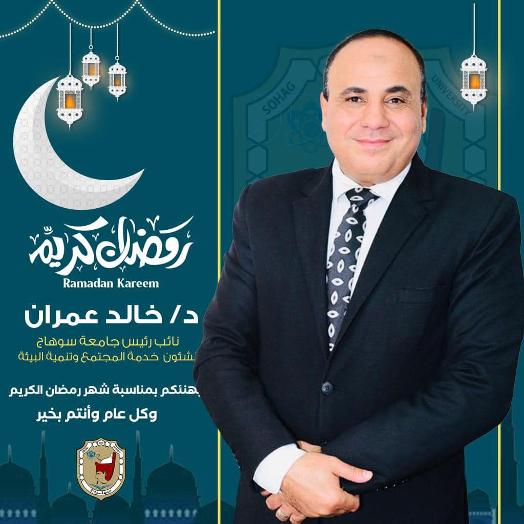 يتقدم الدكتور خالد عمران نائب رئيس جامعة سوهاج لشئون خدمة المجتمع وتنمية البيئة بأصدق التهاني لكافة منسوبي الجامعة من أعضاء هيئة التدريس والهيئة المعاونة والعاملين والطلاب بمناسبة حلول شهر رمضان المبارك، داعياً الله تعالى أن يتقبل صالح الاعمال، وان يهله علينا بالأمن، والإيمان والتوفيق والسداد على أمتينا الإسلامية والعربية.