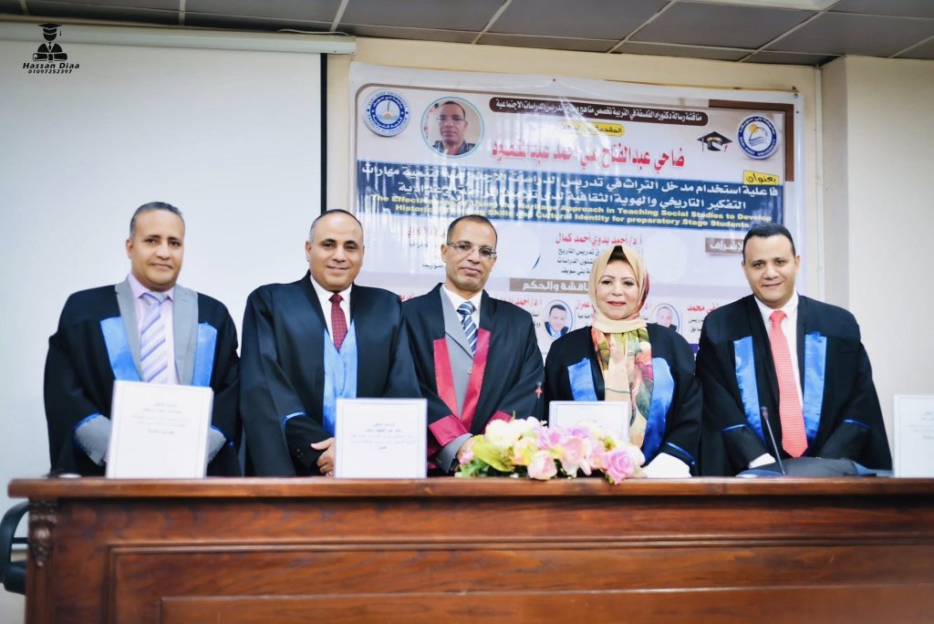 والمعنونة: “فاعلية استخدام مدخل التراث في تدريس الدراسات الاجتماعية لتنمية مهارات التفكير التاريخي والهوية الثقافية لدي تلاميذ المرحلة الإعدادية”.