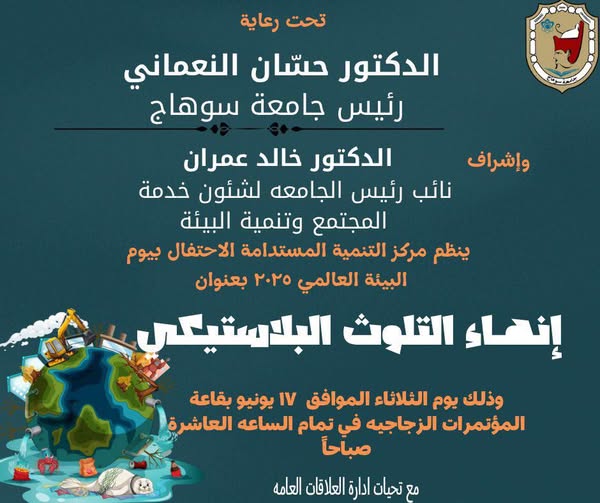 تحتفل جامعة سوهاج باليوم العالمي للبيئة ٢٠٢٥ بتنظيم ندوة تثقيفية بعنوان ” انهاء التلوث البلاستيكي” يصاحبها معرض” لبدائل البلاستيك ومنتجات اعادة تدويره”، وذلك في إطار الاحتفال باليوم العالمى للبيئة، والذي ينفذه قطاع خدمة المجتمع وتنمية البيئة ومركز التنمية المستدامة بالجامعة يوم الثلاثاء الموافق ١٧ يونيه الجاري، بالقاعة الزجاجية بالمقر القديم للجامعة.