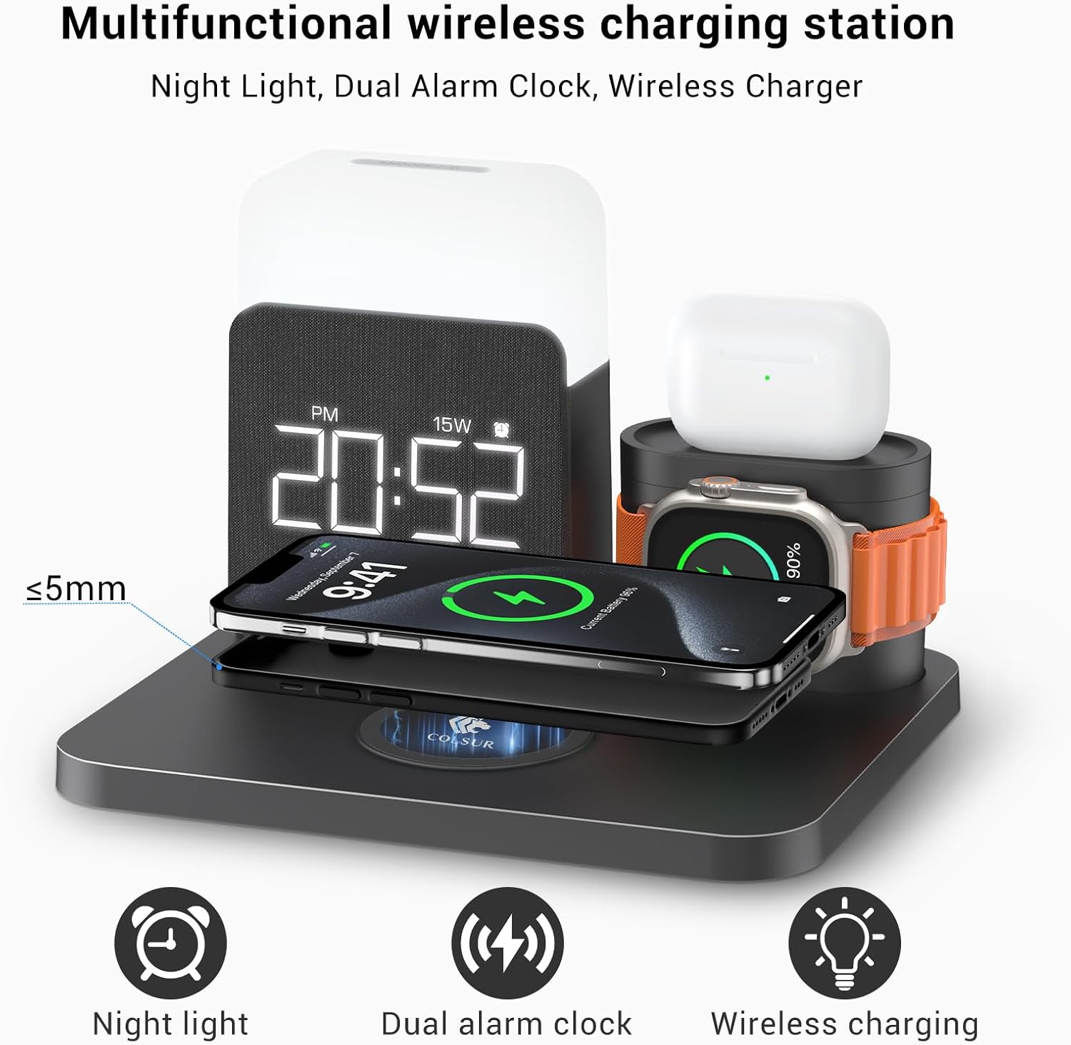 | Compatible Phone Models | Compatible with iPhone 17/16/15/15 Pro/15 Pro Max/15 Plus/14/14 Pro/14 Pro Max/14 Plus/13/13 Pro/13 Pro Max/13 Mini/12/12 Pro/12 Pro Max/12 Mini / 11/11 Pro/11 Pro Max/X/XR/XS/XS Max/8/8Plus; Samsung Galaxy S22 Ultra/S22+/S22/S21 Ultra/S21+/S21/ S21 FE/S20/Note 10; AirPods 1/2 /3/4/Pro; Apple Watch 9/8/7/6/5/4/3/2/SE/Ultra(Please note: only supports Apple Watch) |