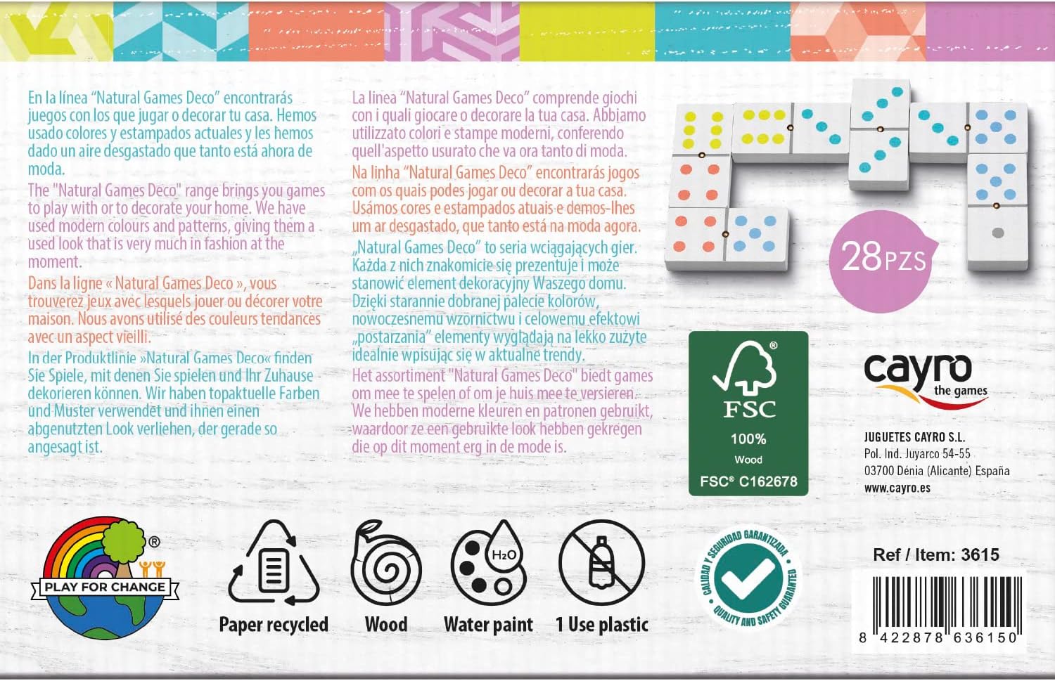 We present you the classic game of dominoes but in a more modern version. This game is within the natural line games Deco, for which we have used the current colours and patterns and you have given a distressed Air that is both fashion now.
