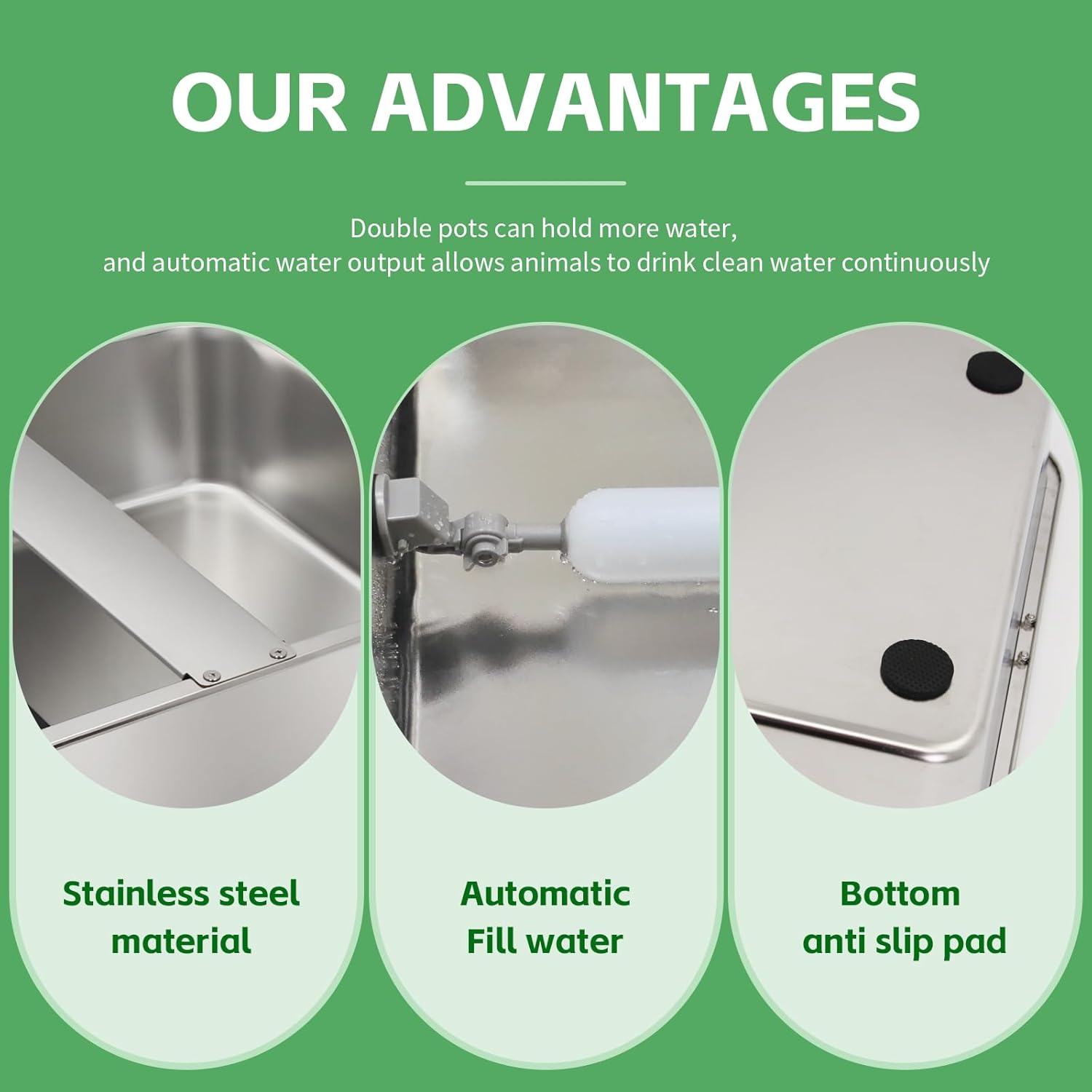 Automatic dog water bowl 13.5L/3.5Gal water feeder with pipe and 1/2 to 3/4”hose adapter Features:About the Hose Adapter:If your faucet was 1/2”, it can connect with the faucet directly. If your faucet was GHT 3/4”, it’s needed to be connected the GHT 3/4”adapter. We also provide an extra GHT 3/4" hose adapter.Non-slip Pads With 4pcs Non-slip Pads , it can let the bowl stay away from ground, which can make sure the bowl keep dry and clean.Specifications :Materials :Bowl:Stainless Steel, Non-slip Pads: EVASize:Bowl: L:42cm/16.5ich ; W: 32cm/12.6ich ; H:10cm/3.94ich.Capacity: 13.5L/3.5GalAnti-slip Mats:3.7cm/1.46inchPackage :1*automatic dog water bow (with float valve)4x anti-slip matsNote:While the dispenser is undoubtedly convenient, it's essential to remember to monitor water quality regularly, especially during hot weather, to make sure water in the bowl is fresh at any time.