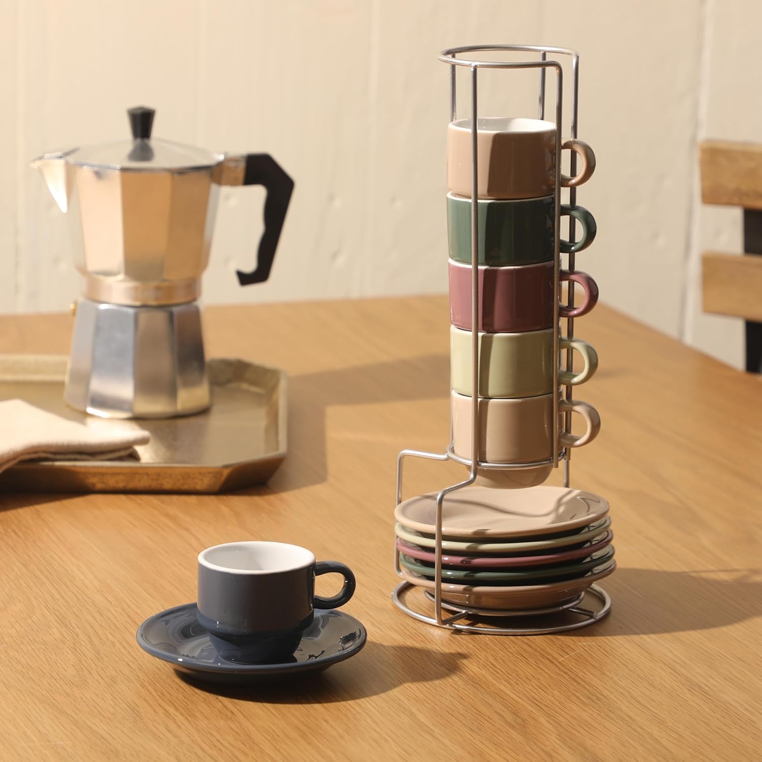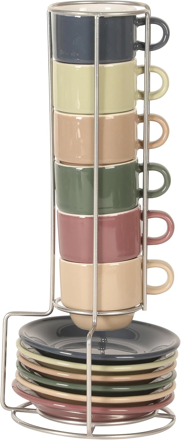 Get in sync with your best vibes of the day with the Brew Harmony 13‑Piece Espresso Cup Set. Crafted from durable stoneware, each espresso cup pairs with a matching saucer, both finished in bold, eye-catching colors with a smooth glaze. Designed for everyday use, all cups and saucers stack neatly in the sturdy metal rack to save space. Whether it’s a quick shot of espresso or a slow midday sip, this set is your perfect companion for a daily fix of caffeine and a boost of energy anytime. Dishwasher and microwave safe. To clean the metal rack, wipe it with soft, damp cloth. Make every home a Gibson Home. A multi-category collection of kitchen and dining essentials, Gibson Home offers style and value for everyday living. Enjoy preparing, cooking, and serving delicious meals in a wide selection of dinnerware, cookware, bakeware, cutlery, glassware, and more. Designed with function, reliability, and versatility, Gibson Home provides dining and entertaining staple to make every mealtime or gathering a culinary success.