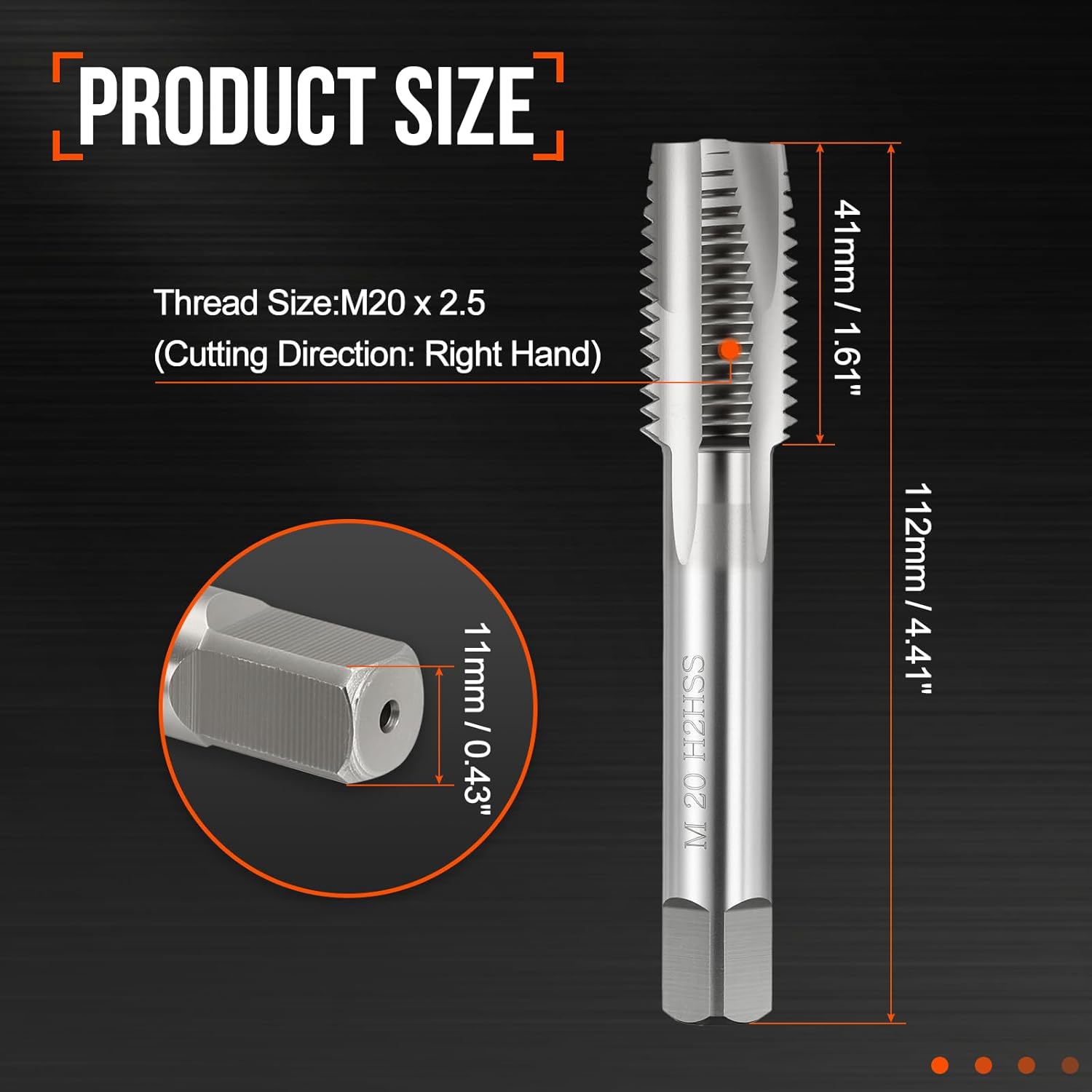 [Spiral Point Tap Size]: Thread Size: M20 x 2.5 (Cutting Direction: Right Hand), Thread Length: 41mm / 1.61 inch, Total Length: 112mm / 4.41 inch, Square Shank Diameter: 11mm / 0.43 inch[Straightforward Installation]: Spiral point taps are designed for use with manual tools (such as tap wrenches) and machine tools (such as drilling machines, milling machines, lathes and machining centres). Control the speed according to material hardness—the higher the hardness, the slower the speed. First drill the holes with a twist drill bit, then perform tapping with a thread tap. Maintain a 90° vertical angle during tapping and keep the operation stable.[Broad Application]:Spiral point taps are suitable for through-hole threading operations. Thread taps are widely suitable for stainless steel, aluminum, alloy steel, carbon steel, cast iron, non-ferrous metals, hard plastics and various other materials, delivering reliable and efficient tapping performance.[Reliable and Durable]: Hand taps are constructed from M2 High Speed Steel, which significantly improves toughness and wear resistance. Features a Polished coating finish that reduces friction, improves chip removal, and ensures smoother, more precise threading with less wear, while providing excellent anti-corrosion and anti-rust properties.[Package Inclusions]:1 Pcs x Spiral Point Plug Threading Tap. Designed with a spiral point structure and precise right-hand threads, this tap ensures smooth cutting and stable performance for professional through-hole processing.