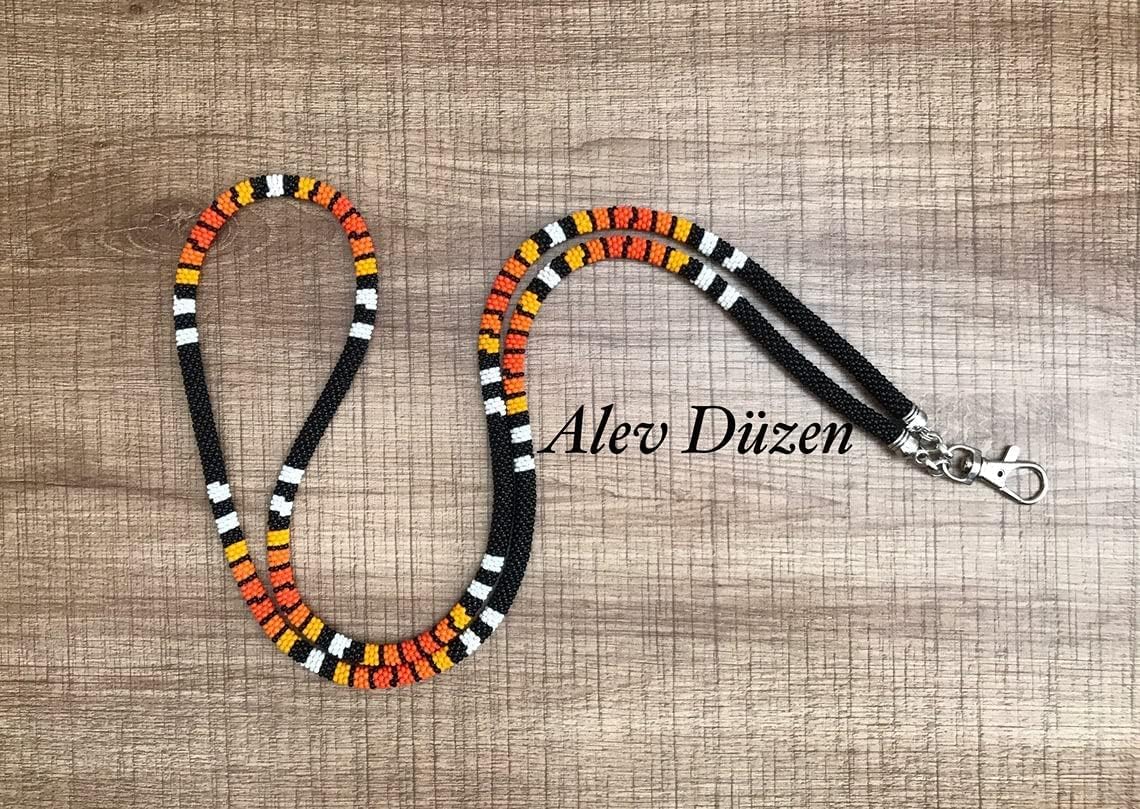 A crocheted rope lanyard crafted with high-quality Japanese seed beads (bright) size 11/0, featuring 6 stitches per round. The lanyard measures 87 cm (34.2 inches) in length. This elegant bead crochet card holder comes packaged in a beautiful gift box, making it perfect for gifting. Please note that actual colors may vary depending on monitor settings. Before ordering, carefully review the product dimensions, color, and material specifications.