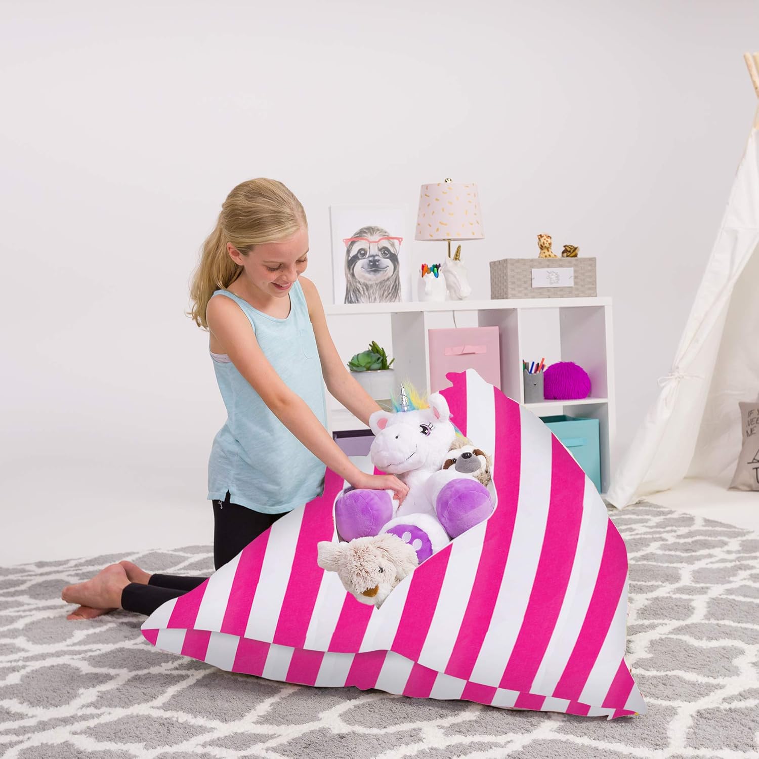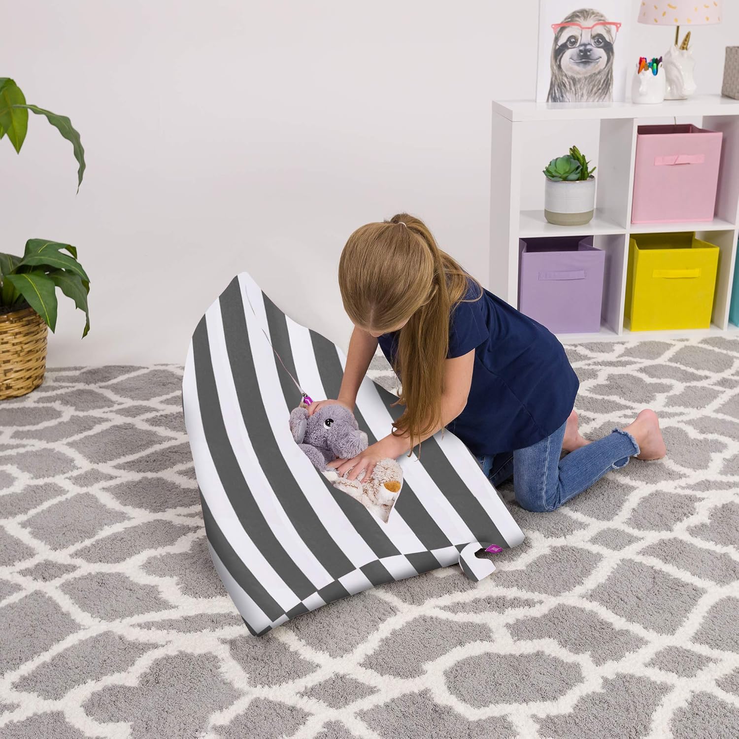 PRODUCT SPECIFICATIONS: We have two popular sizes. The 27” inch bean bag cover is perfect for your young child with enough space for a large amount of stuff able animals but still small enough to be portable for the youngest child. The 38” inch bean bag cover is great your older children and is large enough to fit older children and has a higher capacity for stuffed animals. STUFFED ANIMAL BEAN BAG SOLUTION: Creates a storage solution for all your child’s stuffed animals and toys while creating a soft comfy chair for them to enjoy VARIOUS SIZES AND LARGE CAPACITY: We have a number of sizes to choose from to ensure you have the right sized bean bag cover to meet your needs. Depending on the size of the stuffed animals the capacity is around 95+ stuffed animals KID FRIENDLY PRODUCT DESIGN: Extra large zipper openings with heavy duty YKK zippers to allow easy access for stuffing toys, stuffed animals, blankets and pillows inside your Posh Stuffable. PREMIUM SOFT AND FUN FABRICS: Our stuffed animal storage bean bags come in ultra soft fabric with fun patterns and designs to fit any room decor. MAKING ROOM CLEANUP FUN AGAIN: Turn the dreaded ‘time to clean up your room’ conversation into a fun activity that allows your child to build their own comfy chair while cleaning up their room in the process.