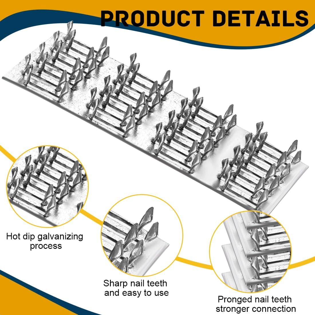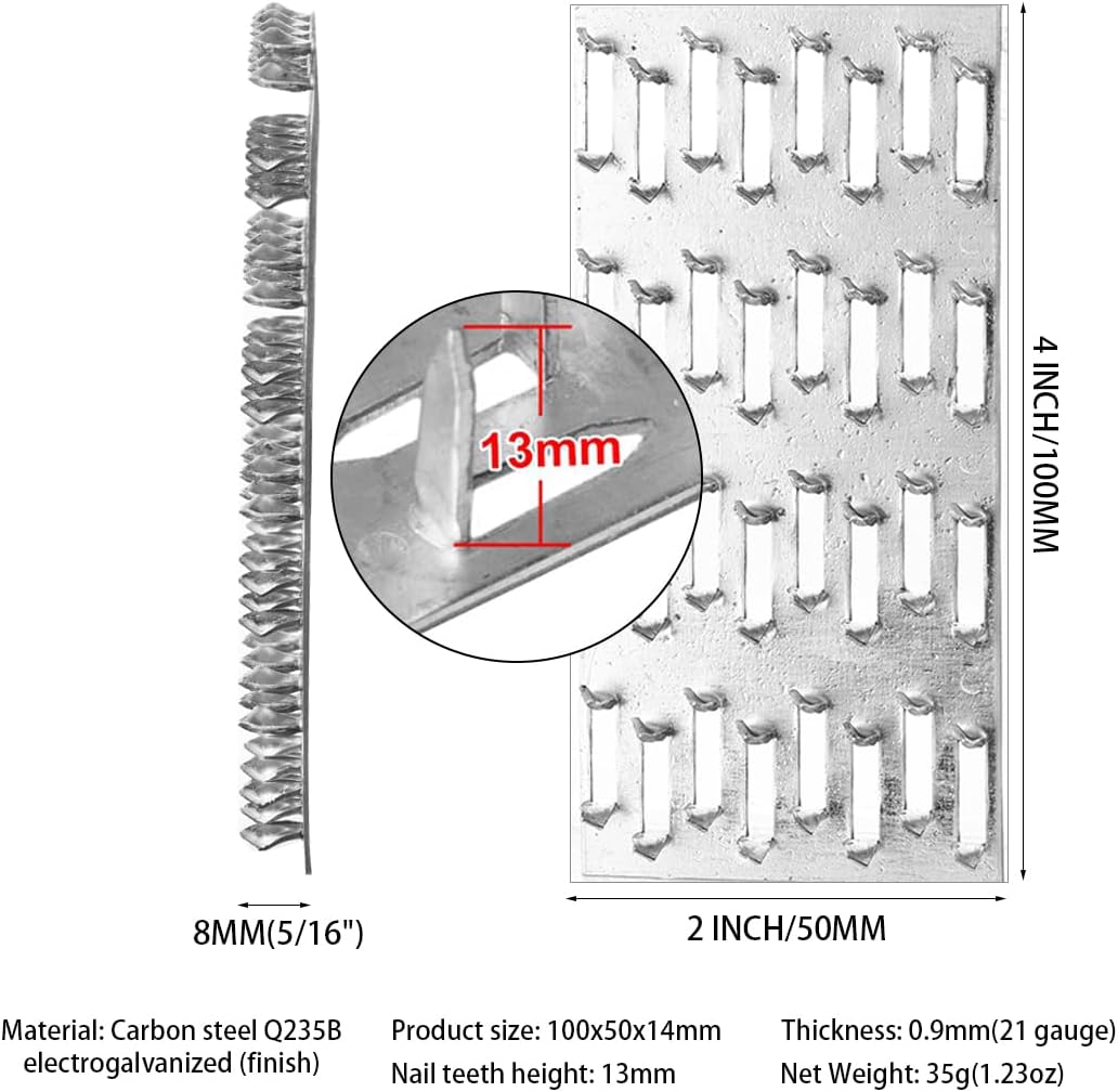 -- Pronged Truss Plate Flat Mending Plates Repair Tie Plate Bracket Galvanized Steel 1 mm Thick Nail Teeth Height 8mm for Roofing Trusses Wood Timber Connectors (2”x4”, 10) -- made of carbon steel -- 2 x 4 inches/ 5 x 10 cm in size -- thickness is 1mm -- the height of the nail teeth is 8 mm/ 0.3 inch --includes 10 pieces staggered-tooth metal plates -- suitable for for roof truss timber connections, pull plate furniture fixing, splicing and miscellaneous wood to wood connections