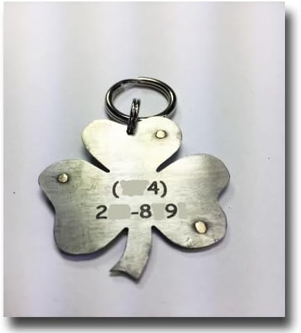 Unique Shamrock Clover Dog Pet ID Tag- Brass and Nickel Silver Handmade and Riveted. Riveted and hammered brass on top and nickel silver bottom. Customized with your pet's name on the front and a phone number on the back. Paw print engraved on top. Oxidized for an antique look and sealed to help resist tarnish and preserve patina. Available in 4 sizes. Sizes listed are widths.