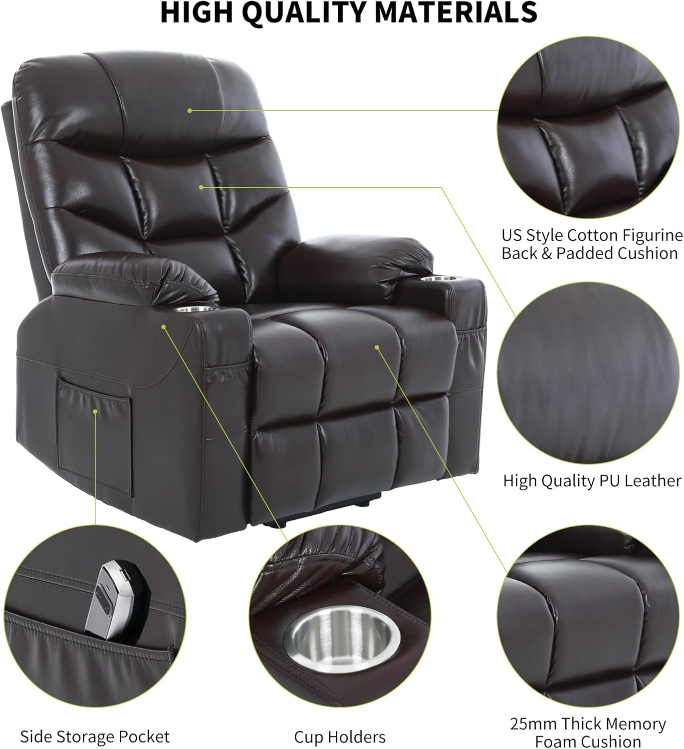 | Additional Features | Cup Holders, Ergonomic, Power Lift, Power Recliner, Wide |