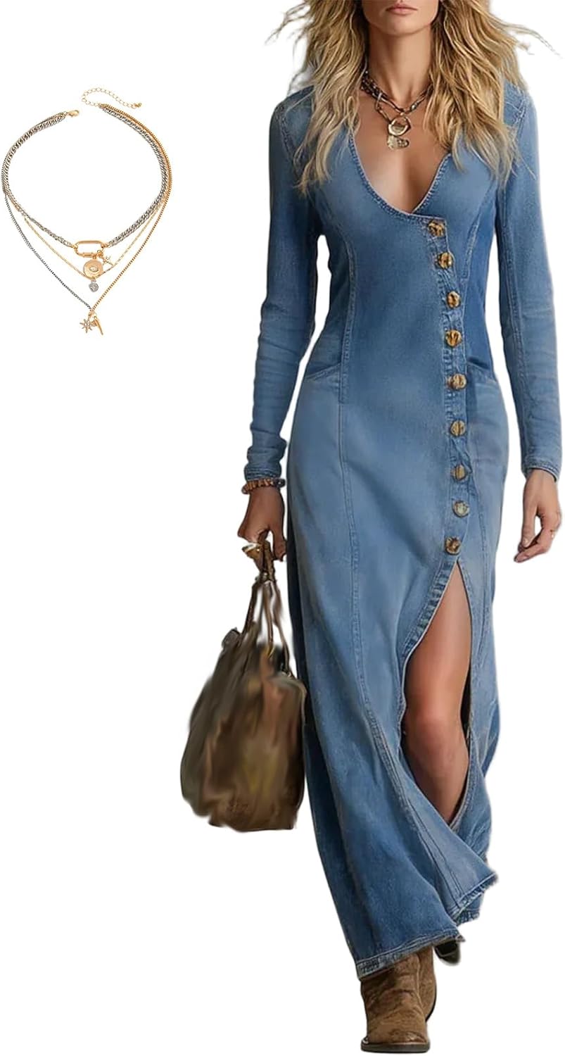 Women's Long Sleeve Button Down Denim Maxi Shirt Dress Casual Lapel Side Slit Long Jean Shift Dress Sweet Denim Dress for Women Trendy Long Sleeve Button Down Denim Maxi Dress Bodycon Slit Long Jean Dresses Women's Denim Maxi Dress Fashion High Waist Long Sleeve Button Down Shirt Jean Dress with Pockets Features: Soft and lightweight fabric provides breathable comfort for all-day wear.Deep V-neck design adds a stylish and flattering feminine touch.Long sleeves and button-down front create a classic denim shirt dress look.Side slit detail enhances movement while adding a modern, trendy style.Slim bodycon silhouette highlights natural curves for a flattering fit.Functional pockets offer convenience for carrying small essentials.Easy to style with boots, heels, or sneakers for different looks.Perfect for casual outings, dates, festivals, or everyday fashion wear. Specification: Product Name:button up maxi dress for women Color: Black/Blue Size: S-XXL Material: Denim Style: button up denim dress Suitable for:Perfect for Many Occasions,Ideal for casual outings, date nights, festivals, or city strolls, this long jean dress for women balances comfort and style. The elegant length and classic design capture the relaxed vibe of a long western dress while delivering the fashionable appeal of a denim dress maxi for everyday or special moments. The package includes: 1pcs*long button down dress for women 1pcs*Stacked necklaces Note: 1.Due to the difference between different monitors or color reflection in the monitor lighting,background etc,the picture may not reflect the actual color of the item. 2.Please allow 1-3mm error due to manual measurement.