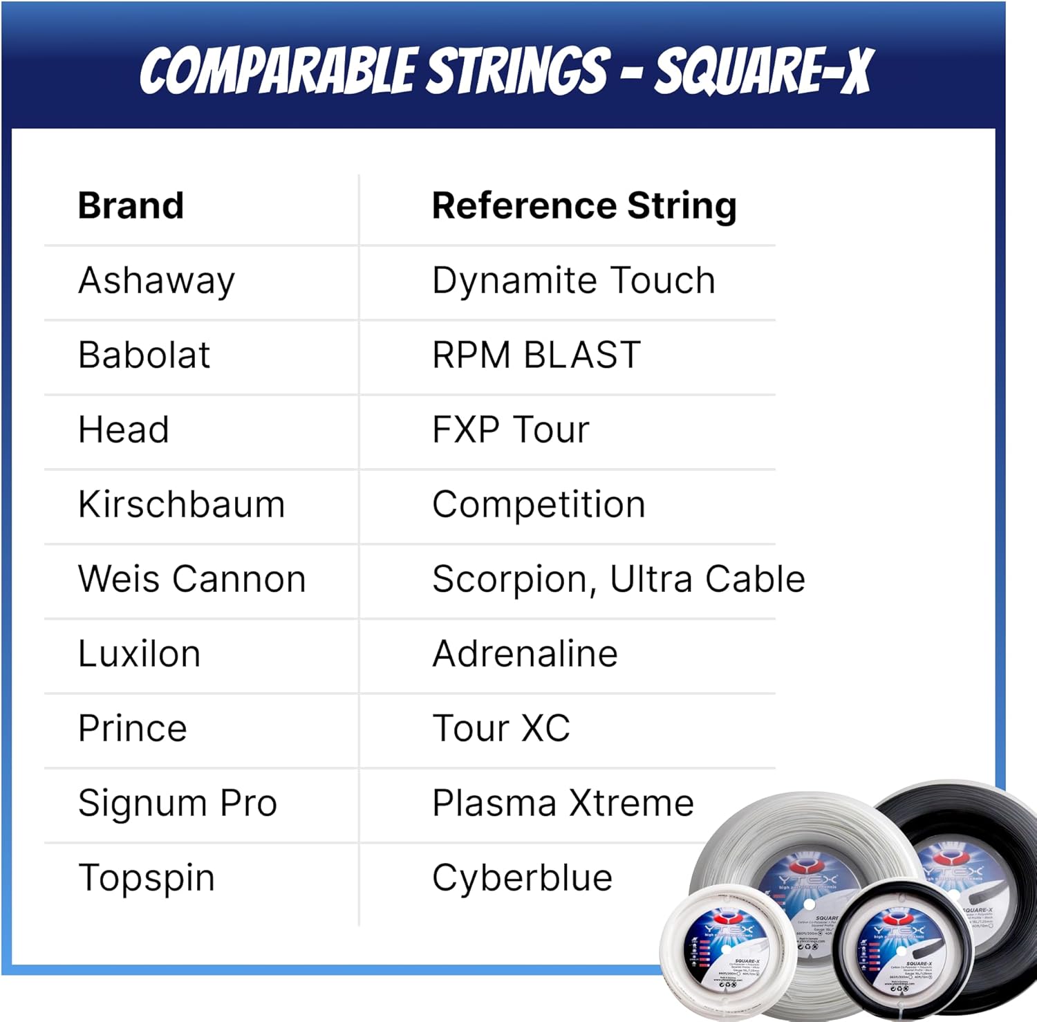 The Square-X is easily in our Top 3 best selling co-polys for its softness and incredible feel. Most players we know who played with rpm have switched to the Square-X not only because of the price but it’s playability and durability. If you want a very soft co-poly which is easy on the arm; incredible feel and durable but less than half the cost of rpm...then switch to the Square-X. Made in Germany where only the best are made. Two Flat surfaces, mains/crosses, in contact with each other give extra durability, no notching and the string returns very quickly from any movement after hitting the ball. It measures 1.20mm across the flat sides and therefore plays like a much thinner string increasing power and control. We have only one word to describe this string: Unique! Note: The BLACK COLOR on this string does play SOFTER than the white so be sure to get the right color according to what you are looking for in a string. The white color has a crispier feel and a bit stiffer than the black color. Made in Germany where only the best tennis strings are made.
